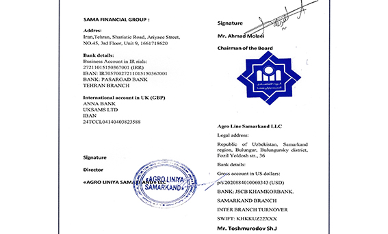 انعقاد تفاهم نامه رسمی سما با شرکت AGRO LINIYA SAMARKAND LLC ازبکستان در زمینه های مختلف اقتصادی، سرمایه گذاری، حمل و نقل و همکاری های بین المللی.