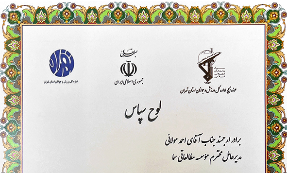 تقدیر و تشکر از جناب آقای احمد مولائی (مدیرعامل سما) توسط فرماندهی بسیج اداره کل ورزش و جوانان استان تهران، جهت قدردانی از زحمات و تلاش های ایشان در اجرای ماموریت های بسیج اداره کل ورزش و جوانان استان تهران در سال 1401.