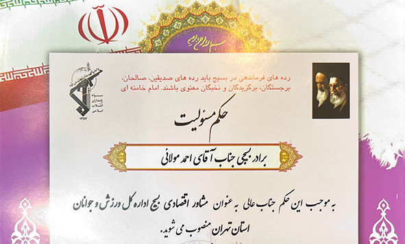 به موجب این حکم، جناب آقای احمد مولائی (مدیرعامل سما) به سمت مشاور اقتصادی بسیج اداره کل ورزش و جوانان استان تهران از سوی فرماندهی بسیج اداره کل ورزش و جوانان استان تهران منصوب شدند.