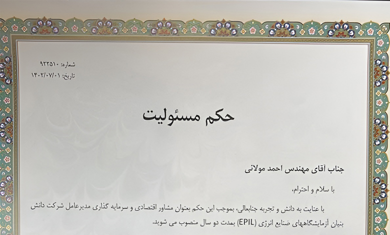 با عنایت به دانش و تجربه جنابعالی، به موجب این حکم به عنوان مشـاور اقتصـادی و سرمایـه گذاری مدیرعامل شرکت دانش بنیان آزمایشگاه های صنایع انرژی (EPIL) به مدت دو سال منصوب می شوید.