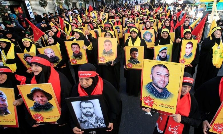 تشییع دستهجمعی رزمندگان مقاومت؛ شرکتکنندگان تصاویر شهدا را در دست دارند که نماد فداکاریهای داخلی و وفاداری به اصول است.